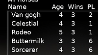 Here are screen dumps of the sort of data available to stable owners: This is a list of all horses showing age, wins, racing strength and stable owner When you click on a horse in the first list (e.g...